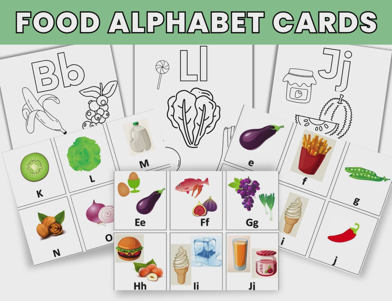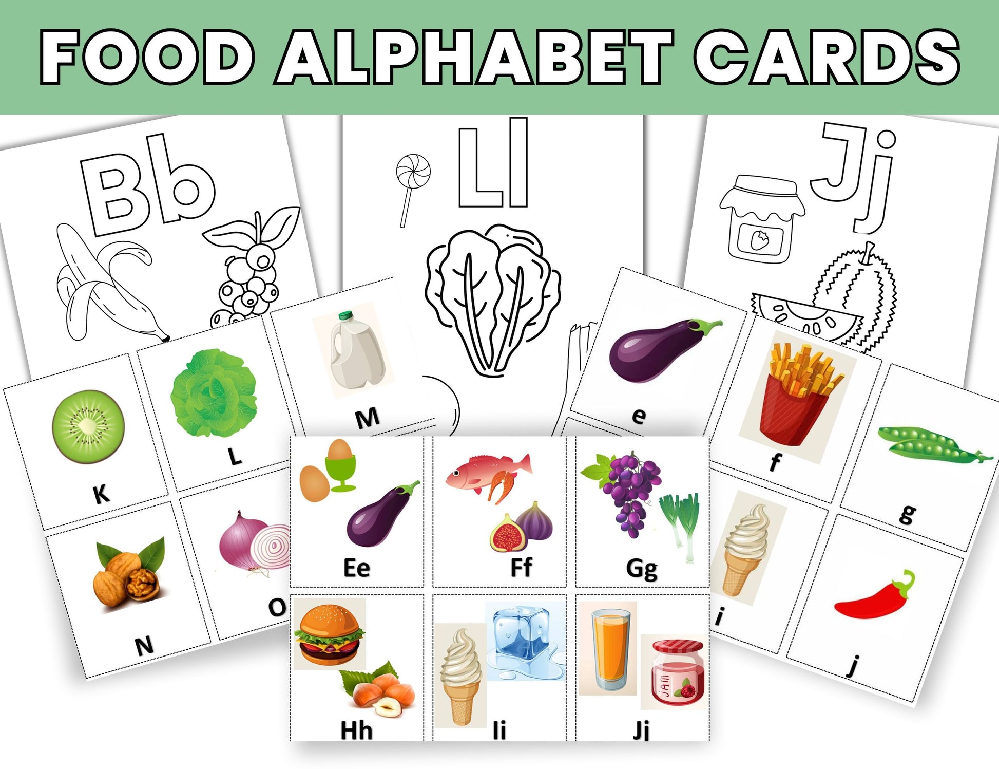 Food Alphabet Cards, Game and Coloring Sheets-Educational A-Z Food-Themed Letter Cards-Digital Download