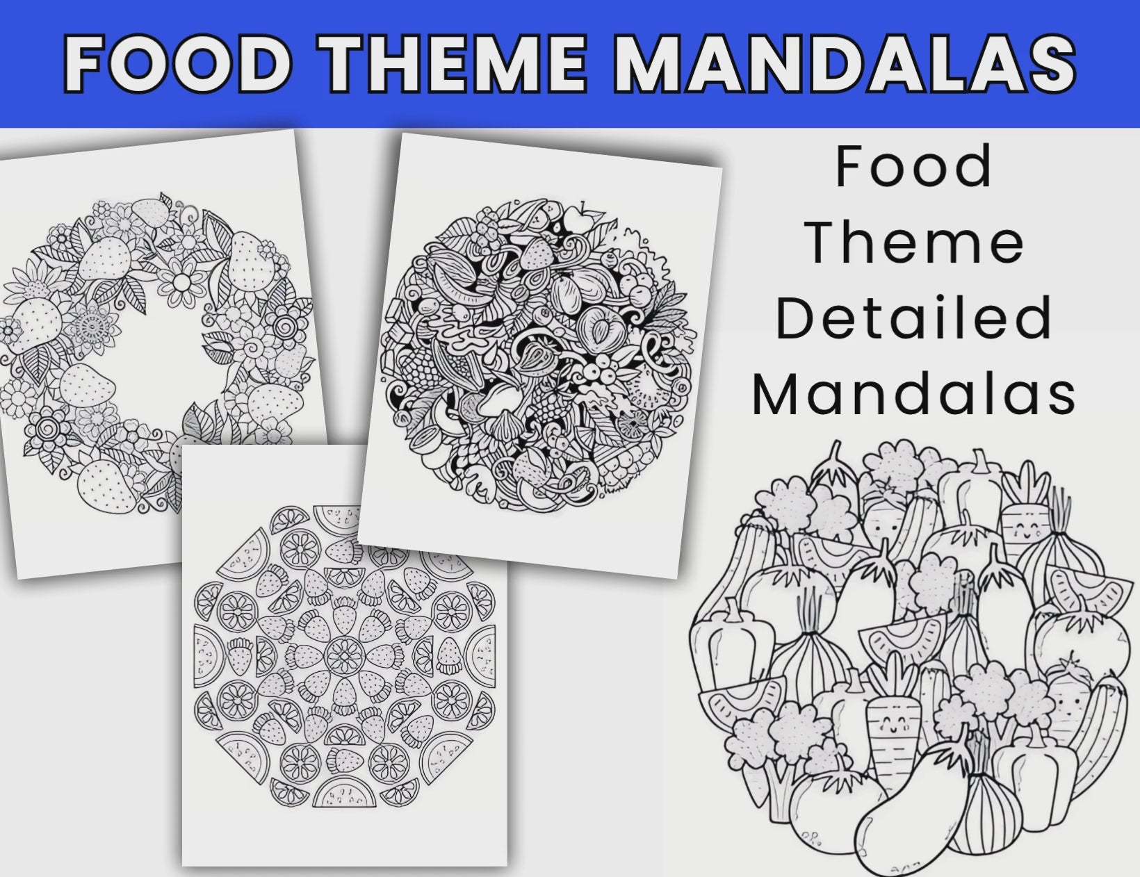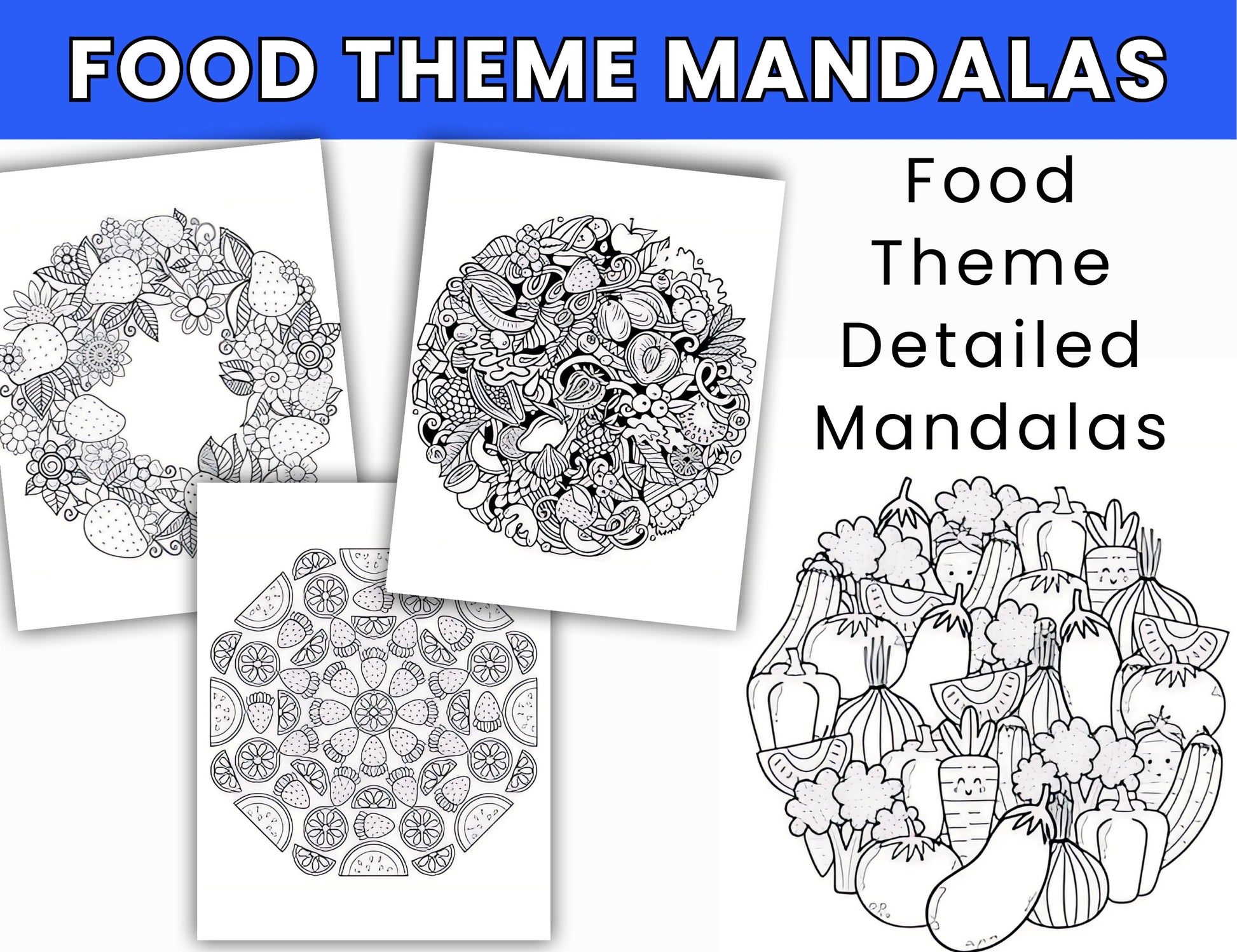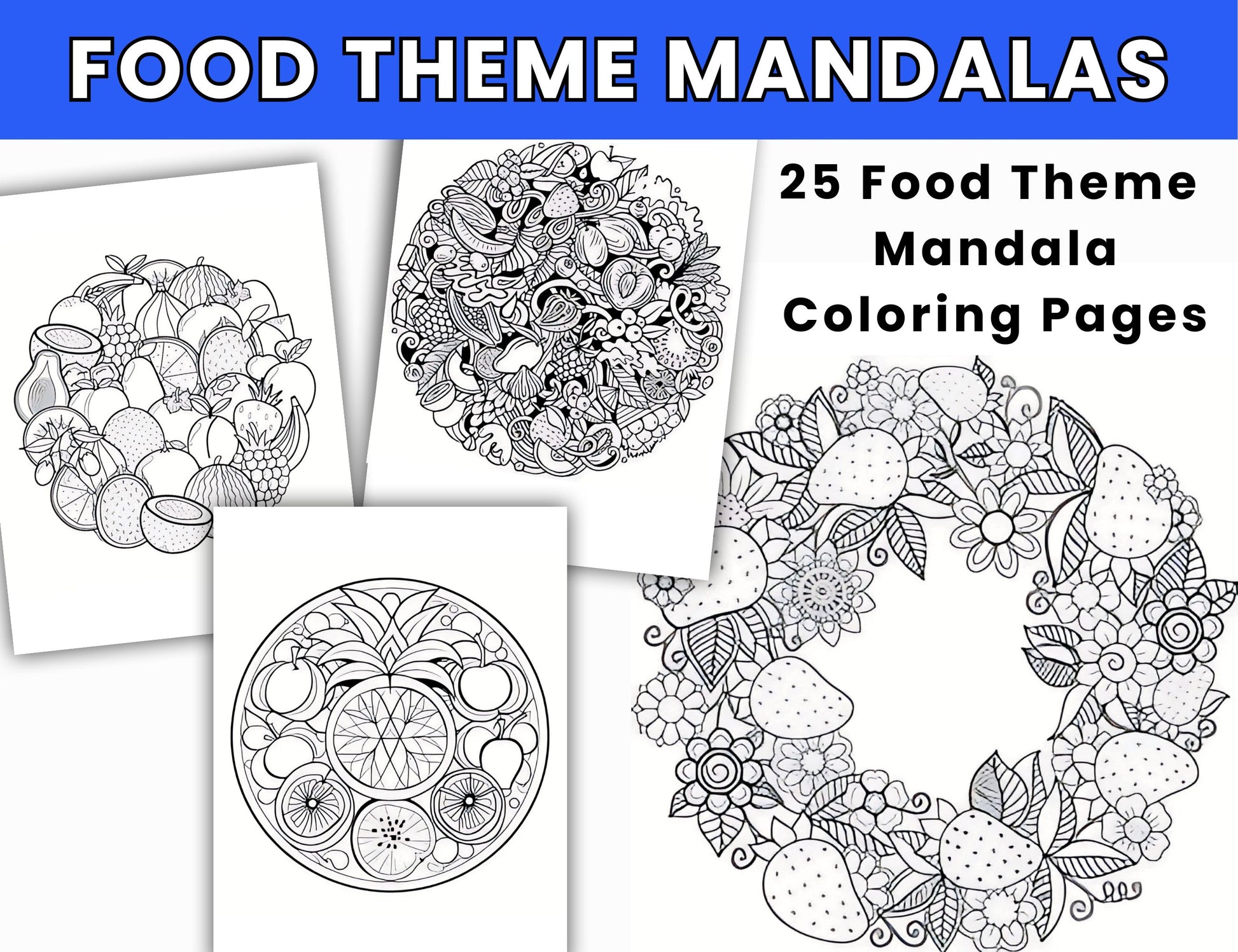 Food-Themed Mandala Detailed Coloring Pages-30 Coloring Food Mandalas- Digital Download