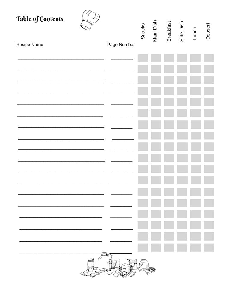 - A table of contents to organize recipes by name, page number, and meal type